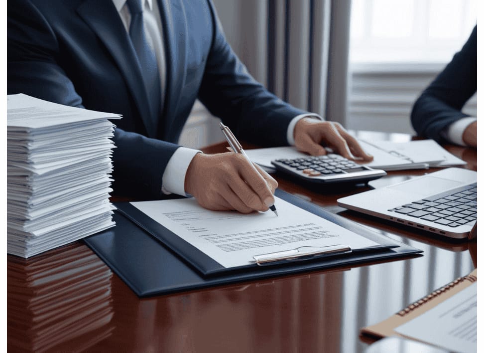 Zdjęcie przedstawia scenę windykacji należności. Na pierwszym planie widoczna jest ręka adwokata trzymająca długopis i podpisująca dokumenty związane z dochodzeniem długów. Na biurku leżą niezapłacone faktury, kalkulator oraz teczka z aktami sprawy, symbolizujące profesjonalne podejście do odzyskiwania należności. W tle znajduje się eleganckie biuro, co nadaje zdjęciu formalny i prawniczy charakter. Oświetlenie jest naturalne, podkreślając powagę sytuacji i profesjonalizm kancelarii.