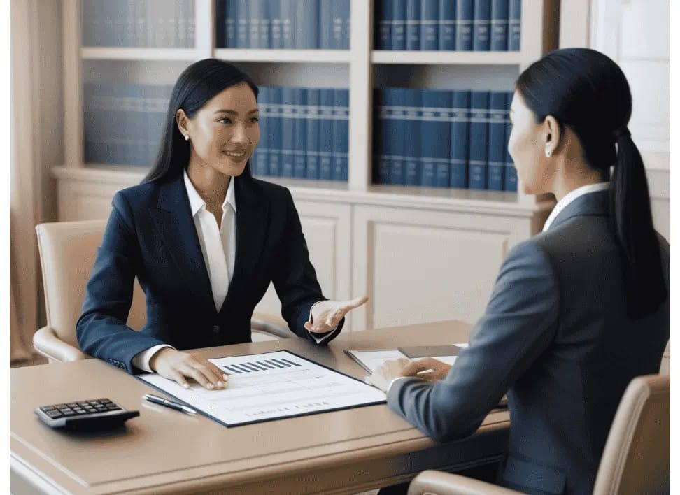 Zdjęcie przedstawia rozmowę dotyczącą wynagrodzenia za usługi prawne. Na pierwszym planie widoczne są dokumenty z wyliczeniami kosztów porady prawnej oraz kalkulator, symbolizujące przejrzystość opłat. Adwokat w formalnym stroju siedzi przy biurku, omawiając szczegóły wynagrodzenia z klientem. Klient analizuje dokumenty, co podkreśla klarowność zasad współpracy i rzetelne podejście kancelarii. W tle eleganckie biuro prawnicze z półkami pełnymi książek, podkreślające profesjonalizm. Naturalne oświetlenie dodaje zdjęciu autentyczności i podkreśla formalny charakter spotkania.