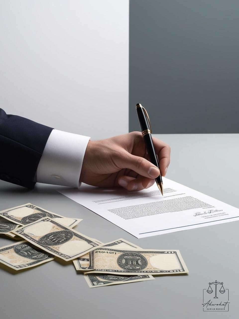 Zdjęcie przedstawia mężczyznę podpisującego dokument obok rozłożonych banknotów, symbolizując przestępstwo oszustwa. Sprawdź, jak adwokat w Rzeszowie może Ci pomóc.
