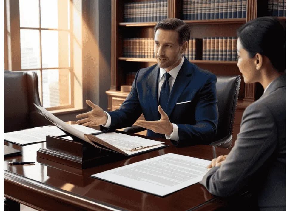 Zdjęcie przedstawia profesjonalne doradztwo prawne w kancelarii adwokackiej. Adwokat w garniturze analizuje dokumenty i udziela klientowi porad prawnych. Na biurku znajdują się dokumenty, długopis i otwarty kodeks prawny, co symbolizuje formalny charakter spotkania. Klient uważnie słucha, co podkreśla indywidualne podejście i zaangażowanie prawnika. W tle widać eleganckie wnętrze kancelarii z półkami pełnymi książek prawniczych. Oświetlenie jest naturalne i ciepłe, co nadaje scenie profesjonalizmu oraz atmosfery zaufania.
