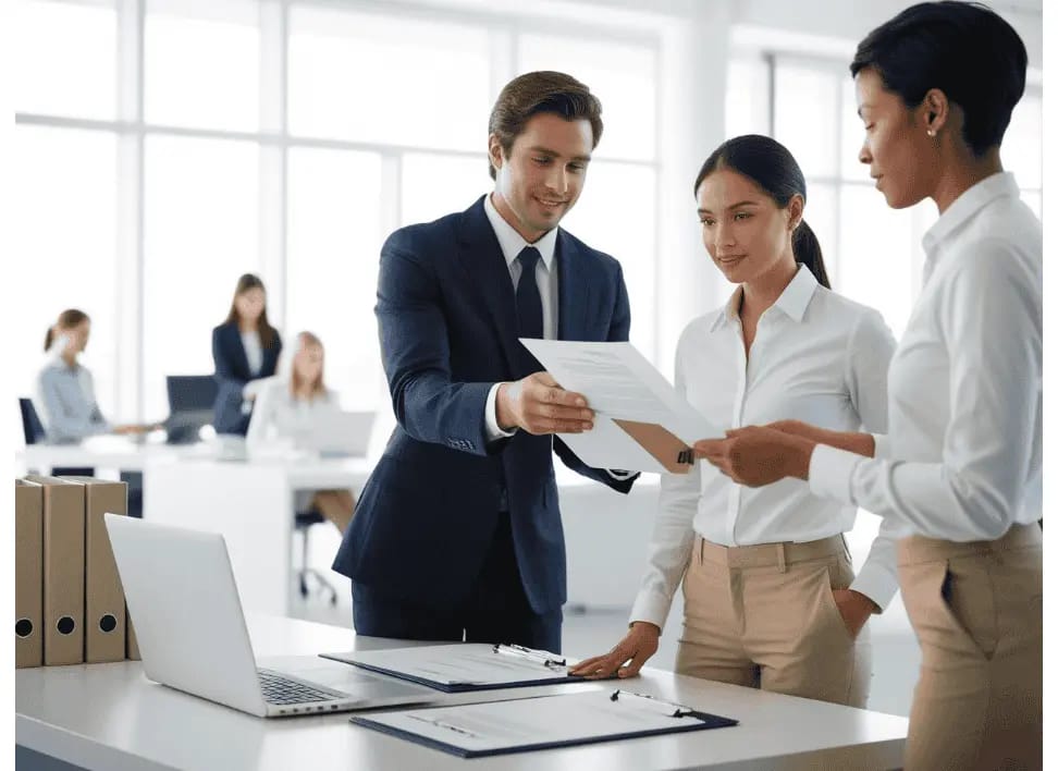 Zdjęcie przedstawia scenę konsultacji prawnej dotyczącej prawa pracy. Na pierwszym planie widoczny jest adwokat analizujący dokumenty związane z umową o pracę lub wypowiedzeniem. Klient, siedzący naprzeciwko, uważnie słucha i trzyma długopis, co sugeruje omawianie kluczowych kwestii związanych z zatrudnieniem, odszkodowaniami czy ubezpieczeniami społecznymi. W tle znajduje się eleganckie biuro kancelarii prawnej z półkami pełnymi książek prawniczych, podkreślające profesjonalizm i doświadczenie. Oświetlenie jest naturalne, a ton zdjęcia neutralny, wskazujący na formalny charakter spotkania.
