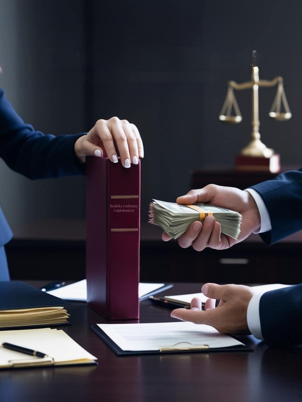 Zdję­cie sym­bo­li­zu­je kwe­stie praw­ne zwią­za­ne z roz­wo­dem i ali­men­ta­mi. Przed­sta­wia doku­men­ty roz­wo­do­we, kodeks praw­ny oraz ele­men­ty kan­ce­la­rii adwo­kac­kiej, pod­kre­śla­jąc for­mal­ny cha­rak­ter spra­wy. Kom­po­zy­cja nawią­zu­je do pro­fe­sjo­nal­nej pomo­cy praw­nej w zakre­sie ali­men­tów po rozwodzie.