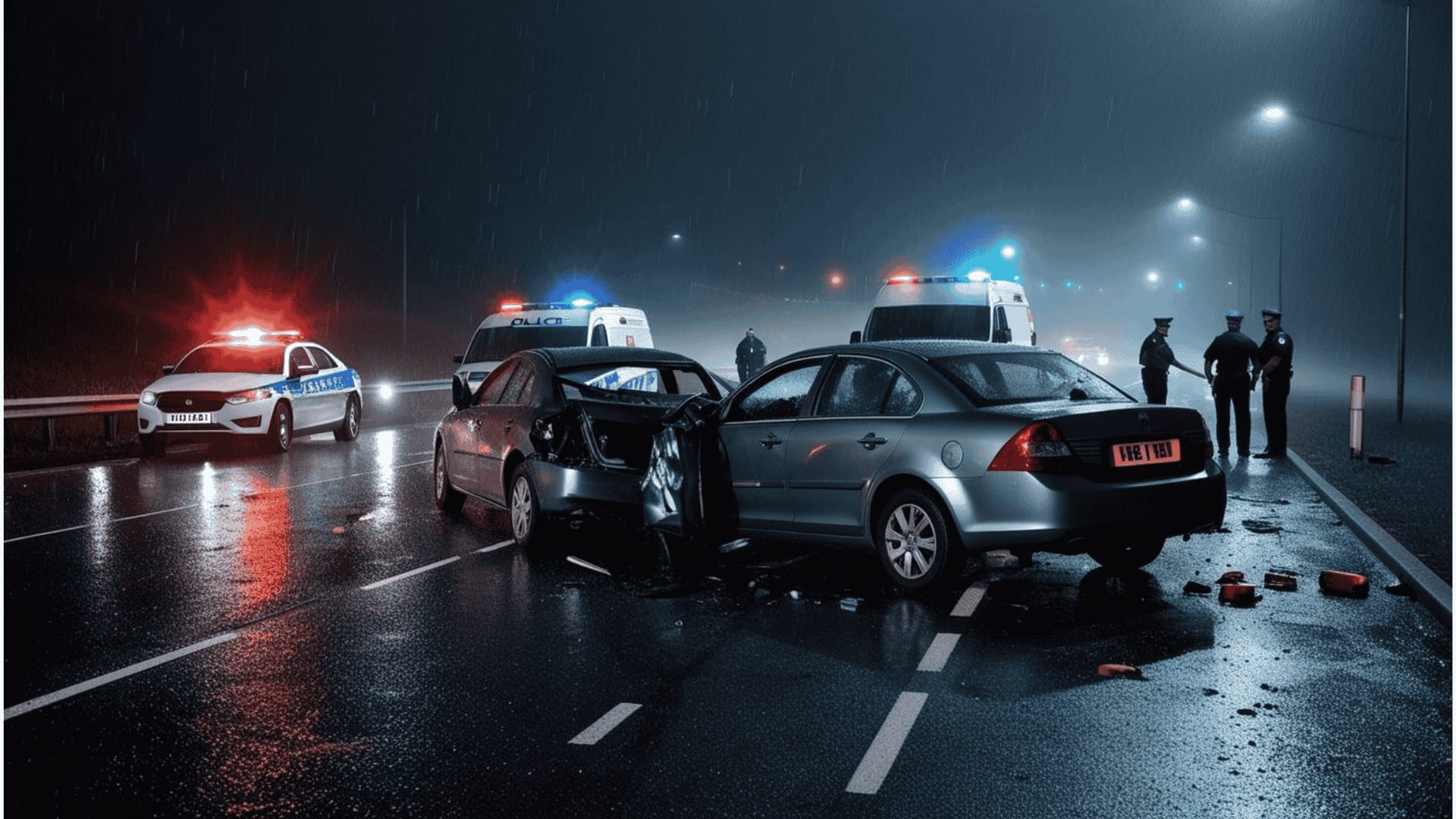 Zdję­cie przed­sta­wia miej­sce wypad­ku dro­go­we­go, na któ­rym widocz­ne są uszko­dzo­ne pojaz­dy, dzia­ła­nia służb ratun­ko­wych oraz noc­na sce­ne­ria z roz­pro­szo­ny­mi świa­tła­mi. Obraz nawią­zu­je do tema­ty­ki odpo­wie­dzial­no­ści kar­nej spraw­cy wypad­ku dro­go­we­go i wspar­cia praw­ne­go świad­czo­ne­go przez Kan­ce­la­rię Adwo­kac­ką Adwo­kat Damian Murdza.